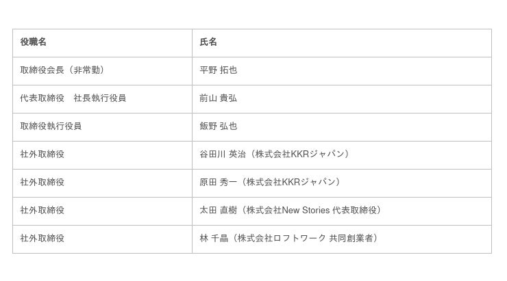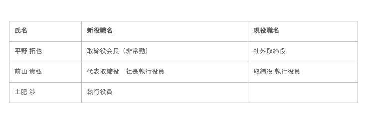 さらに、昨年10月に社外取締役として当社に参画した平野拓也 (元 日本マイクロソフト株式会社 代表取締役社長 / 現 Three Fields Advisors Co-founder/共同設立者)が、同日付けで当社の取締役会長(非常勤)に就任します。