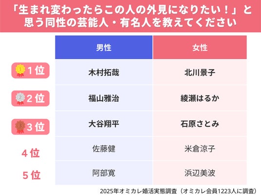 令和の婚活者が選ぶ「生まれ変わったらなりたい外見の芸能人・有名人」、第一位は木村拓哉さん&北川景子さん
