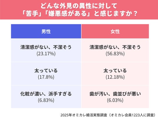 ・男女共に「清潔感がない・不潔そうな見た目」や「太っている」「ボサボサの髪」の人を苦手と感じる傾向が強い