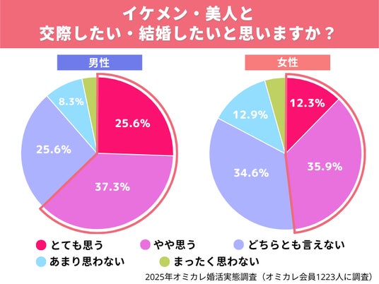 男性のなんと約63%・女性の約48%が、「イケメン・美人と交際したい・結婚したいと思う」と回答。