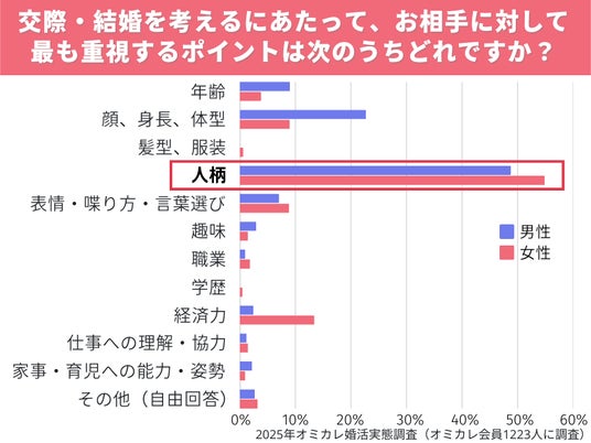 男女共に半数ほどが、交際相手・結婚相手に対しての最重視ポイントとしてあげる「人柄」。