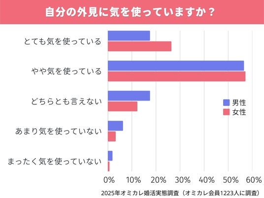 男性は女性に比べ交際相手・結婚相手の見た目を重視する人が多い傾向にありますが、自分自身の見た目については気にしない人が女性に比べて多いようです。