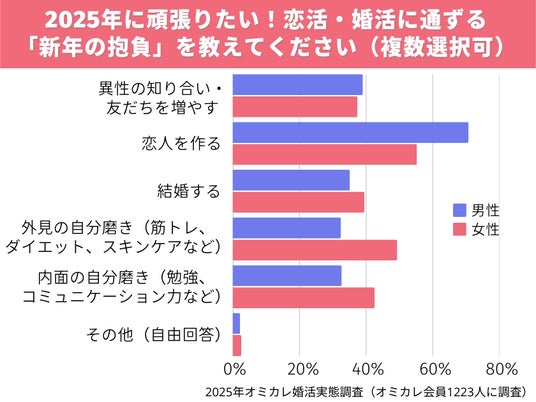 男女共に、2025年は「恋人を作る」を恋活・婚活に通ずる抱負に掲げる人が多い傾向。