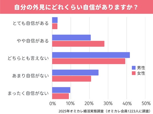 女性は自分の外見に自信がある人とない人がほぼ同数ですが、男性は自分の見た目に自信がない人の方が10%多い結果となりました。