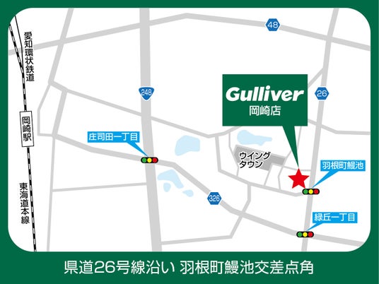 当店は、JR岡崎駅から南東へ直線で約2キロの場所に位置しております。県道26号線(竜東メーンロード)の羽根町鰻池交差点近くにあり、おクルマでのアクセスが良好です。店舗に面する県道26号線は、国道1号線や国道248号線など複数の幹線道路と接続しているため、岡崎市内だけでなく、周辺市町からもお越しいただきやすい立地となっております。