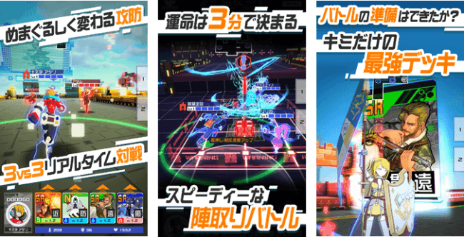 1チーム3人で仲間とチームを組み、「1バトル3分間」で相手チームとステージに配置された拠点を奪い合うリアルタイム対戦ゲームです。また、スキルカードを集めて、組み合わせによる多彩な戦略で最強のデッキを作り、対戦に備えることができます。アクションゲーム、戦略ゲーム、カードゲームの要素を、1バトル3分に凝縮して詰め込んだ、まったく新しいジャンルのスマートフォンゲームです。