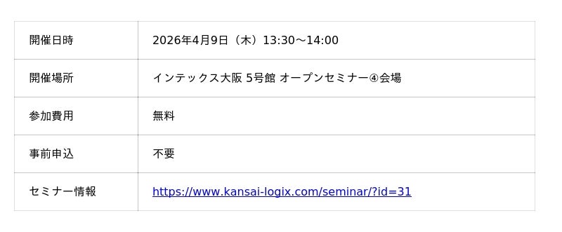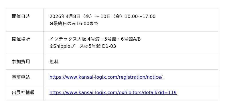 貿易DXを推進し「Shippio Platform」を運営する株式会社Shippio(本社:東京都港区、代表取締役CEO:佐藤 孝徳、以下Shippio)は、2026年4月8日(水)~10日(金)にインテックス大阪で開催される「第7回 関西物流展」に出展いたします。