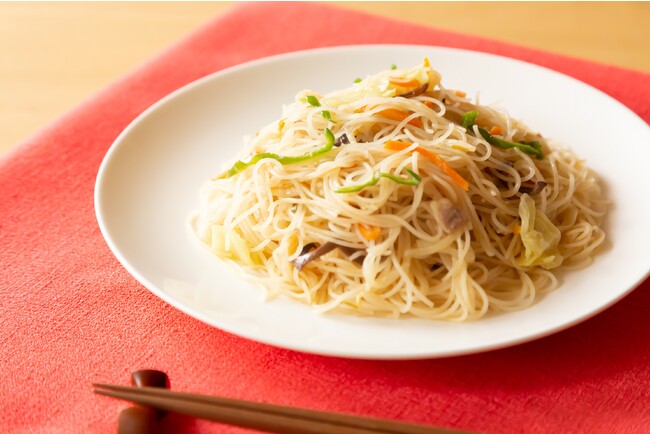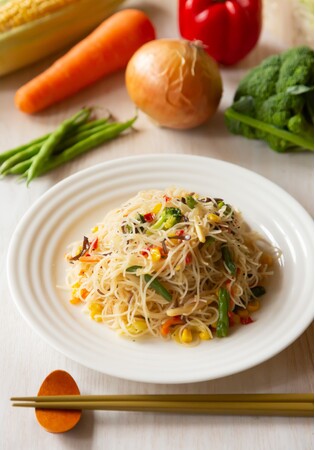 お米100%で作ったビーフンに国産豚肉と野菜を使い、素材の旨味と彩にこだわった一品です。