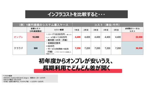 また、オンプレミスとクラウドのインフラコストを比較すると、初年度からオンプレミスの方が安く、長期利用においてその差がさらに開いていくことが分かります。