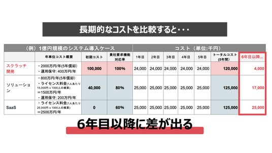 近年、システム開発での課題解決として、SaaS導入の風潮が大きくなっているように見受けられます。しかし、これが本当に正しい判断であるかどうかを検討するために、SaaS・ソリューション・スクラッチ開発のメリット・デメリットを経済的観点から分析したところ、6年目以降に差が生じることが分かりました。