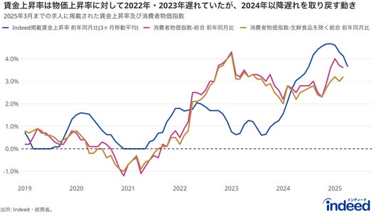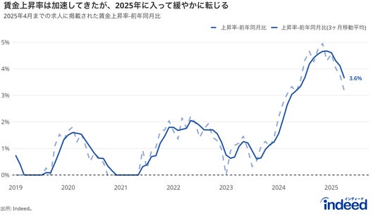 - 2024年にかけて求人上で提示される賃金の上昇率は加速し、2025年に入ると伸びがやや鈍化しているものの、4月時点で前年比3.6%の上昇を示している。