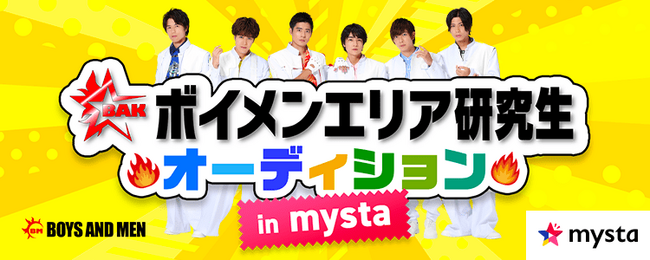 未来のスターを応援するオーディションアプリ『mysta』を運営するmysta株式会社(本社:東京都 港区、代表取締役CEO: 高橋秋仁、以下 mysta)は、東海エリアを拠点に全国にて活躍しているエンターテイメントグループ「BOYS AND MEN」(通称:ボイメン)の弟分のグループ“ボイメンエリア研究生”のオーディションを2023年11月3日(金)より開催いたします。