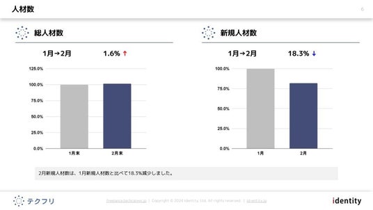 2月新規人材数は、1月新規人材数と比べて18.3%減少しました。