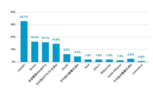 現在活用している、または検討している生成AIツールについて尋ねたところ、最も利用されている生成AIツールはChatGPT(32.7%)で、次いでGemini(16.4%)、自社開発AIモデル(15.7%)と続きました。自社開発モデルの高い採用率は、企業特有のニーズに合わせたカスタマイズへの需要を示しています。