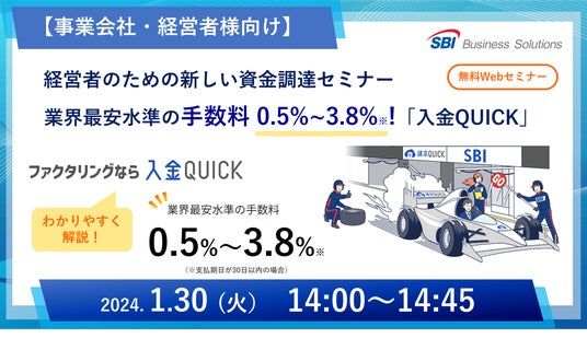 総合フィンテックソリューション企業であるSBI FinTech Solutions株式会社の子会社で、バックオフィス支援サービスを提供するSBIビジネス・ソリューションズ株式会社(本社:東京都港区、代表取締役社長:夏川 雅貴、以下「当社」)は、事業会社・経営者様向けに「業界最安水準の手数料0.5%~3.8%*1!新しいファクタリング 入金QUICKセミナー」を1月30日(火)14時から開催しますので、お知らせいたします。