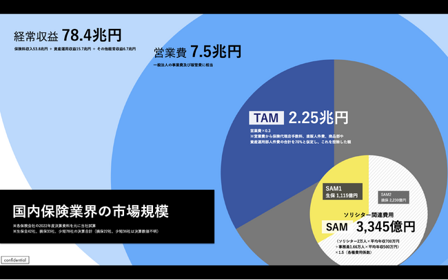 国内保険業界の経常収益は78.4兆円の巨大市場です。営業費7.5兆円の30%に相当する2.25兆円をTAMと定義し、ソリシター関連費用3,345億円をSAMと定義しています。