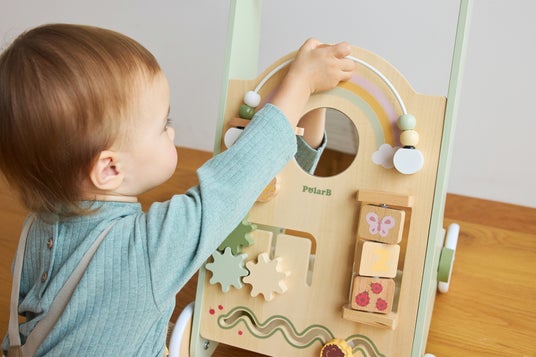 歩きたい!の気持ちを応援するベビーウォーカー。背面の足元部分には布が張ってあるので、お気に入りのぬいぐるみなどと一緒にお散歩を楽しめます。絵合わせ、型はめ、ビーズなど、座ってじっくり楽しめる8つの指先遊び・しかけも付いているので、長く活躍します。