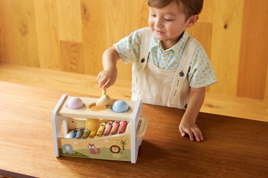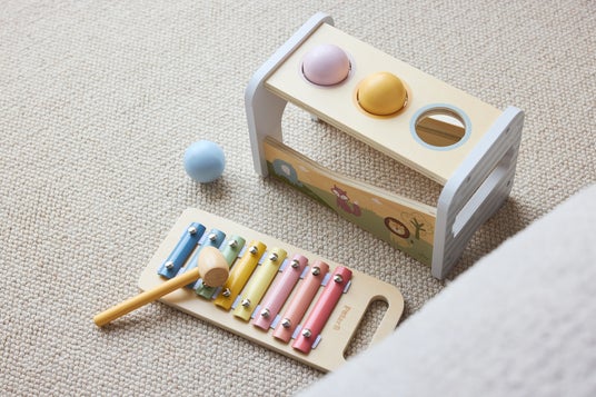 手首を使うハンマー遊びと、音遊びが楽しめるハンマーシロフォン。ハンマーでボールを叩いて落とすと、きれいな音を奏でながらシロフォンの上を転がり、下からコロンと出てきます。シロフォンを取り外して、単体で楽しむことも可能です。