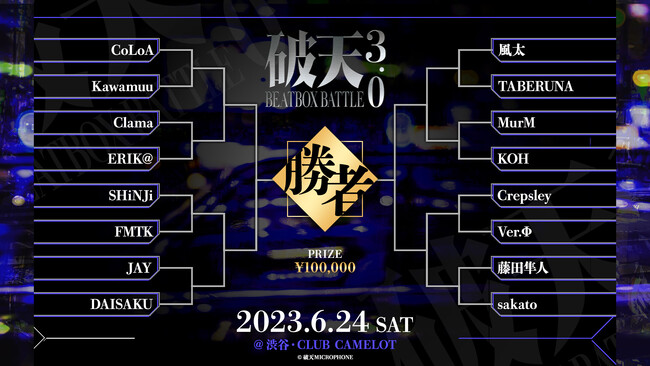『破天BEATBOXBATTLE 1.0』や『破天BEATBOXBATTLE 2.0』からの出場者に加え、新たにDAISAKUやCoLoAなどトッププレイヤーから新世代まで総勢16名のヒューマンビートボクサーによる壮絶なバトルをお楽しみいただけます。