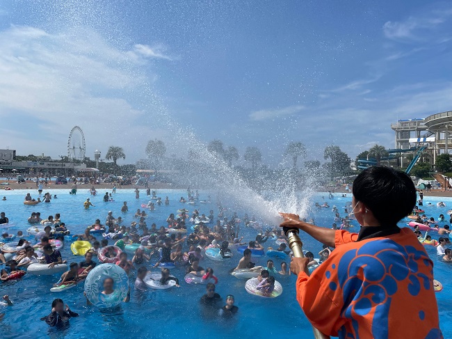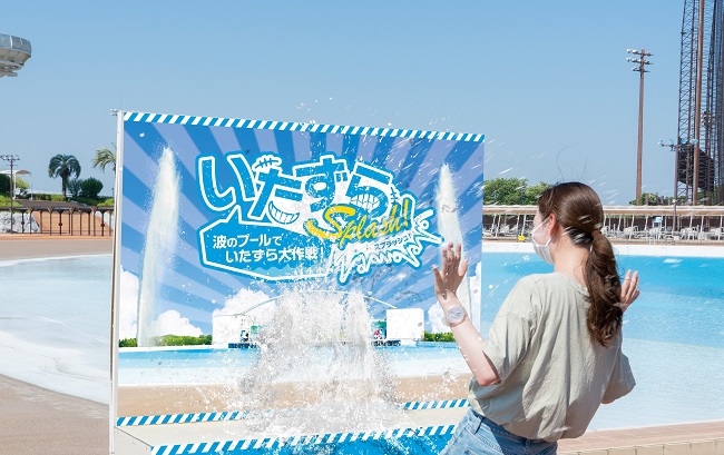 波のプールサイドに、よみうりランドオリジナル「いたずらギミック」が登場します。プールサイドに設置したスイッチを押すと、ランダムでギミックが発動!波のプールにいるお客様や、自分自身に水がかかります。