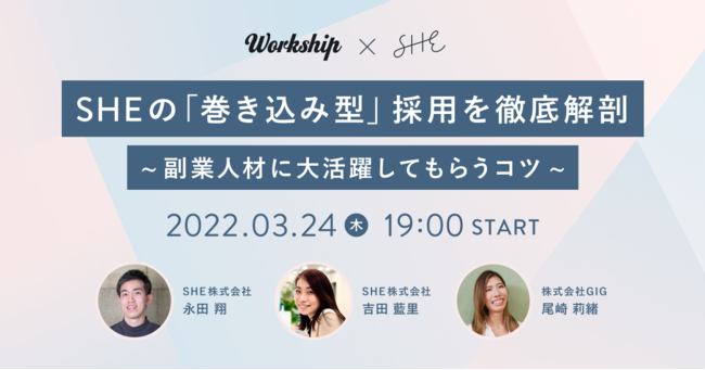 フリーランス・副業向けマッチングサービス『Workship(https://goworkship.com/)』を運営する株式会社GIGは、「【SHE × Workship】SHEの「巻き込み型」採用を徹底解剖 ~副業人材に大活躍してもらうコツ~」をテーマに無料ウェビナーを開催いたします。