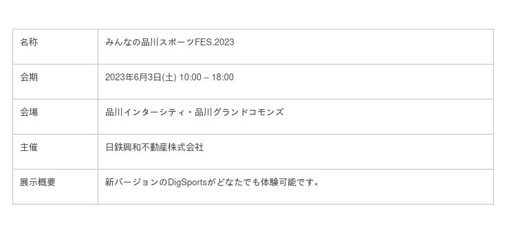 本システムは、6月3日(土)に品川インターシティ・品川グランドコモンズで開催されるイベント「みんなの品川スポーツFES.2023」に先行出展いたします。