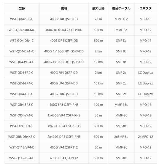当社では、同社が手掛ける製品の中で、NVIDIA AI向けGPUサーバーのネットワーク接続をサポートする最大転送速度400 Gbps、最長10 km の伝送距離に対応したシングルモードファイバーの光トランシーバーとAOC(アクティブ光ケーブル)を注目製品とした上で、同社の様々な転送速度・伝送距離に対応した製品を取り揃えました。より詳細な製品情報については当社Webサイトをご覧下さい。Webサイトに掲載していない同社製品の取り扱いについても承ります。