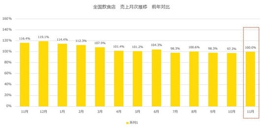 ・11月度の前年対比の売り上げ伸長率は、前月から2.7pt増加した。売り上げは前年対比100.03%で、2か月ぶりにプラスとなった。