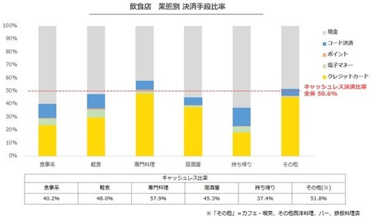 - 業態別のキャッシュレス比率は、すべての業態で35%以上を超える。またコード決済比率が一番高い持ち帰りでは、その割合が14.0%となる。