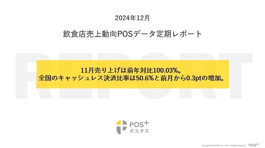 「はたらいて、笑おう。」をビジョンに掲げるパーソルグループでクラウド型モバイルPOSレジの「POS+(ポスタス)」を提供するポスタス株式会社(本社:東京都中央区、代表取締役社長:本田 興一、以下:ポスタス)は、2024年11月度の飲食店売上動向についてPOSデータを基に集計し、結果をとりまとめましたので本日公開します。