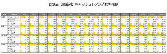 ・キャッシュレス決済手段別では、10月度から11月度で比較すると、居酒屋以外の業態でクレジットカード決済比率が増加した。