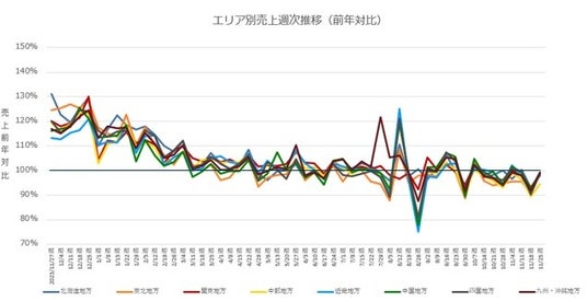 - 11月売上における、前年対比の伸長率(地方平均)は96.7%と前月から1.5pt減少した。地域別に見ると、中国地方が最も高く前年対比98.0%となった。また、11月の客数は、中国地方で前年対比102%となったほか、北海道地方、四国地方でも前年対比100%以上となった。