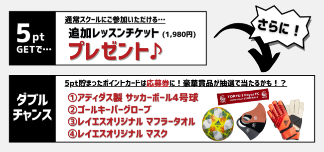対象のプログラムにご参加いただき、ポイントを貯めると追加レッスン1回無料チケット(1,980円)をプレゼントいたします。