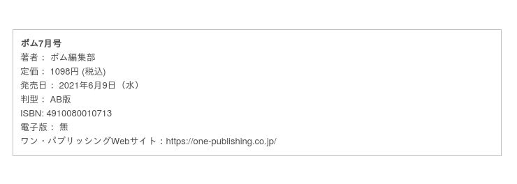 株式会社 ワン・パブリッシング(東京都台東区/代表取締役社長:廣瀬有二)は、「ボム7月号」(特別定価:1098円(税込))を2021年6月9日(水)に発売しました。