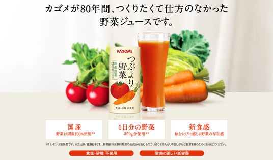 カゴメ公式通販 健康直送便限定の野菜ジュース、「つぶより野菜」は1日分の野菜350gを使用(※1)、家族の健康をサポートします。国産野菜(※2)にこだわった、このジュースをきっかけに、ご家庭の中にあたたかな会話や笑顔が広がることを願っています。