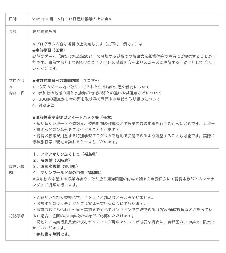 本出前授業は、2021年9月より順次公開するオンライン謎解きゲーム「海なぞ水族館2021」に登場する水族館と海なぞ実行委員会が連携し、昨今の情勢下で学びの機会が減少しつつある子どもたちに海洋問題への理解・関心を深めてもらうべく企画されました。