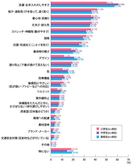 小学・中学・高校生の子どもを持つ保護者が体操服で重視することは、「洗濯・お手入れのしやすさ」(小学生50.4%、中学生60.8%、高校生57.4%)が最も多く、次に「吸汗・速乾性(汗を吸って、速く乾く)」(小学生41.8%、中学生36.6%、高校生37.1%)、「着心地・肌触り」(小学生36.4%、中学生38.6%、高校生36.5%)、「丈夫さ・耐久性」(小学生37.0%、中学生35.6%、高校生35.1%)などを重視する声が多くなりました。また、「特にない」(小学生18.5%、中学生14.6%、高校生18.9%)という回答もみられました。