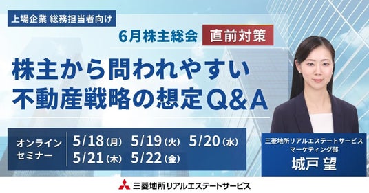不動産総合コンサルティング会社の三菱地所リアルエステートサービス株式会社(本社:東京都千代田区)は、上場企業 総務ご担当者様向けにオンラインセミナー『6月株主総会直前対策 株主から問われやすい不動産戦略の想定Q&A』を5月18日・19日・20日・21日・22日に開催します。