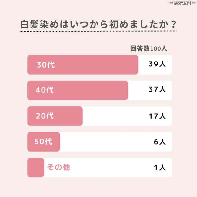 株式会社AWA(https://a-w-a.co.jp/)が運営する白髪染め専門美容室ソマリ(https://a-w-a.co.jp/hennasalonsomari/)は、日本全国の10代以上の女性を対象に「白髪染めはいつから始めましたか?」とアンケート調査を実施しました。