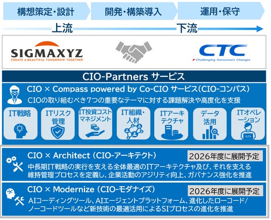 伊藤忠テクノソリューションズ株式会社(代表取締役社長:新宮 達史、本社:東京都港区、略称:CTC)は、株式会社シグマクシス(代表取締役社長:太田 寛、本社:東京都港区、以下 シグマクシス)と連携し、企業の最高情報責任者(CIO:Chief Information Officer)に向けて、企業の戦略立案から実行までを一気通貫で伴走支援する「CIO-Partnersサービス」の提供を開始します。本サービスは、3つのオファリングから構成されており、第1弾として「CIO × Compass powered by Co-CIO サービス(CIO-コンパス)」を展開します。