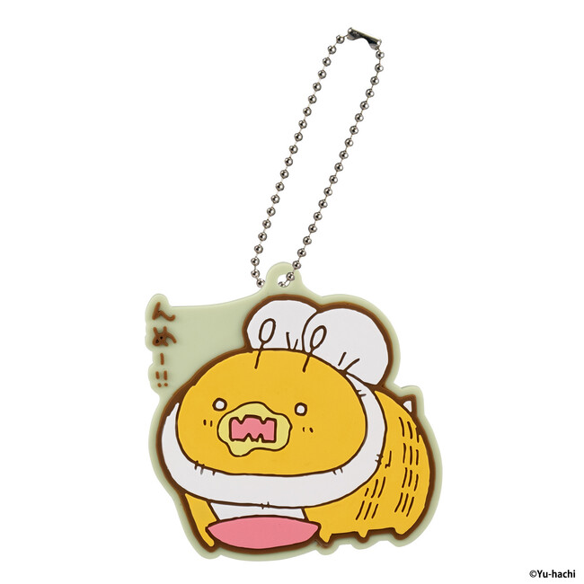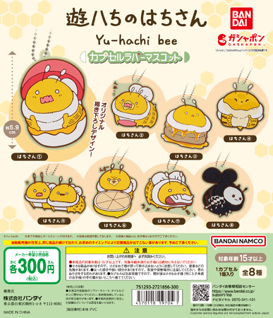 本商品は、SNSで話題のイラストレーター『遊ハち』さんによるイラスト『はちさん』のラバーマスコットです。全8種の展開で、SNS上でいいね数の多い人気イラストから選定したデザイン7種と、なんとガシャポン(R)コラボのオリジナル描きおろしデザインを使用したデザインも。サイズは約5.9cmでバッグやポーチ等に付けて可愛いラバーマスコットです。