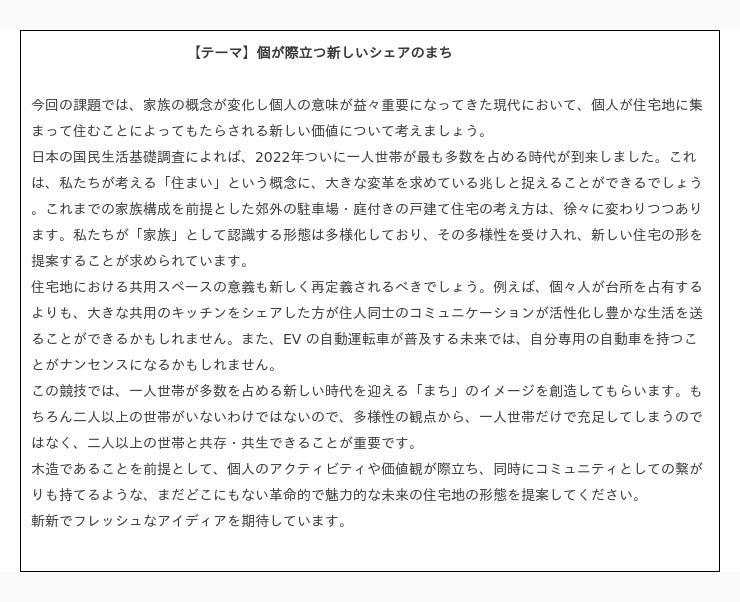 第11 回は、「個が際立つ新しいシェアのまち」をテーマに、2023 年11 月30 日(木)から2024 年5 月9 日(木)にかけて木の家による魅力的な作品を募集いたします。また今回は、賞金総額を昨年の約2 倍となる205 万円へ大幅に増額し、RI 賞(実物件化プロジェクト候補作品の中から特に優秀な作品を表彰)、UJ 賞(大学院生・大学学部4 年生を除く応募者の中で特に優秀な作品を表彰)を新設しました。