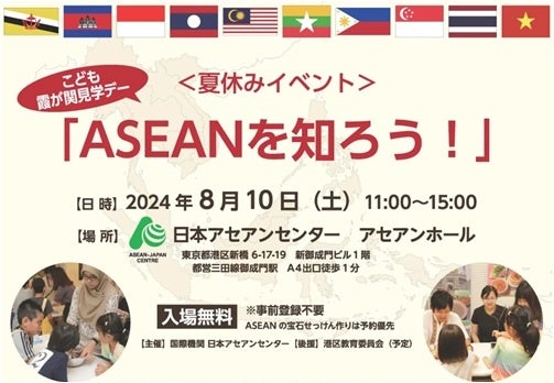国際機関日本アセアンセンター(所在地:東京都港区、事務総長:平林国彦 )は、港区教育委員会後援のもと、「<夏休みイベント>こども霞が関見学デー『ASEANを知ろう!』」と題した、東南アジア諸国の人々との交流並びに現地の文化体験を趣旨とした小学生向けイベントを、2024年8月10日(土)に都内にて開催します。ASEAN諸国の魅力を、音楽鑑賞、バティック作りワークショップ、ボルネオの昆虫と森のおはなし、宝石せっけん作りワークショップ、工作、民族衣装試着、スポーツ体験などを通してたっぷりと紹介するイベントで、子どもたちが楽しみながらASEANについて学べるプログラムを予定しています。