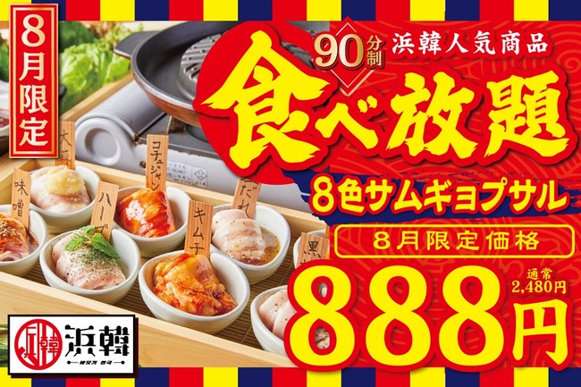浜韓の人気ナンバーワン商品である<8種の味を楽しむことができる「”8色”サムギョプサル」90分食べ放題>を8月8日(月)より期間限定で、通常2,480円のところ【888円】で提供いたします。