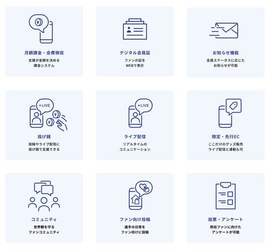 ・ライブ配信、EC、アンバサダー、デジタル会員証などファンマーケティング主要機能をオールインワンで提供