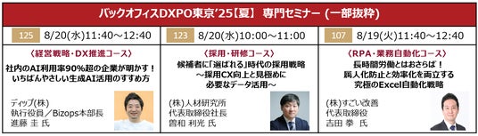 本展では、業界の有識者を講師に招いた「専門セミナー」も同時開催する。経営戦略・DX推進コースでは、自社の生成AI利用率を90%超まで向上させたディップ(株) 執行役員 Bizops本部長 進藤圭氏が、生成AI活用を促進・定着させる方法を紹介、また採用・研修コースでは、人事や採用についてのコンサルティングを行う(株)人材研究所 代表取締役社長 曽和利光氏が、企業が候補者に選ばれる時代に欠かせない、採用プロセスの体験価値向上について解説するなど、人事・総務・経理のプロはもちろん、業務改革・DXを推進する経営者・管理職必聴のセミナーが多数開催される。