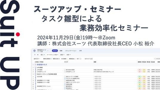 株式会社スーツ(所在地:東京都千代田区、代表取締役社長CEO:小松 裕介)は、2024年11月29日(金)19時から、当社代表の小松が講師を務めるスーツアップ・セミナー「タスク雛型による業務効率化セミナー」を無料開催します。