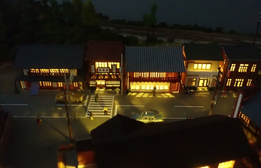 昭和をイメージした街並みのジオラマには、懐かしさを感じるこだわりのポイントが満載。すべての建物にはLEDライトが組み込まれ、スイッチ操作で夕景や夜景を楽しむこともできます。