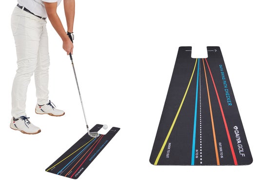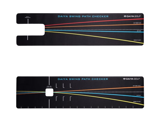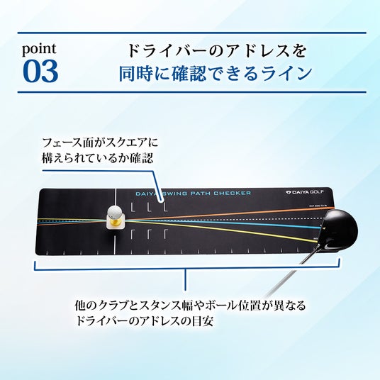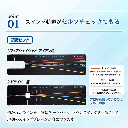 『ダイヤスイングパスチェッカー』は、ストレート・フェード・ドローの打ち分けの目安となるスイング軌道が印字されているマットです。描かれたラインを目安にテークバック、ダウンスイングをすることで球筋に合わせた理想のスイングプレーンが再現できます。ドライバー用、フェアウェイウッド/アイアン用が2枚セットになっており、クラブに合わせたボールポジションが設定されているため、ゴルフ練習場で実際に『ダイヤスイングパスチェッカー』を敷いてボールを打つことができます。