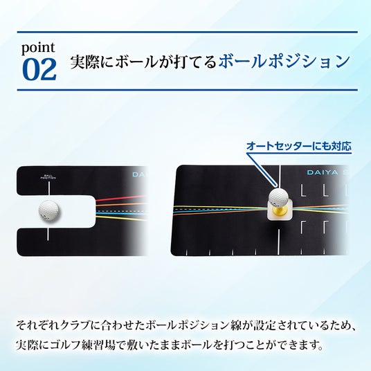 ドライバー用、フェアウェイウッド/アイアン用の2枚がセットになっています。それぞれクラブに合わせたボールポジション線が設定されているため、実際にゴルフ練習場で『ダイヤスイングパスチェッカー』を敷いたままボールを打つことができます。ドライバー用はオートセッターにも対応しているので、ボールポジション線に合わせてティーを穴に通して『ダイヤスイングパスチェッカー』を置くことが可能です。